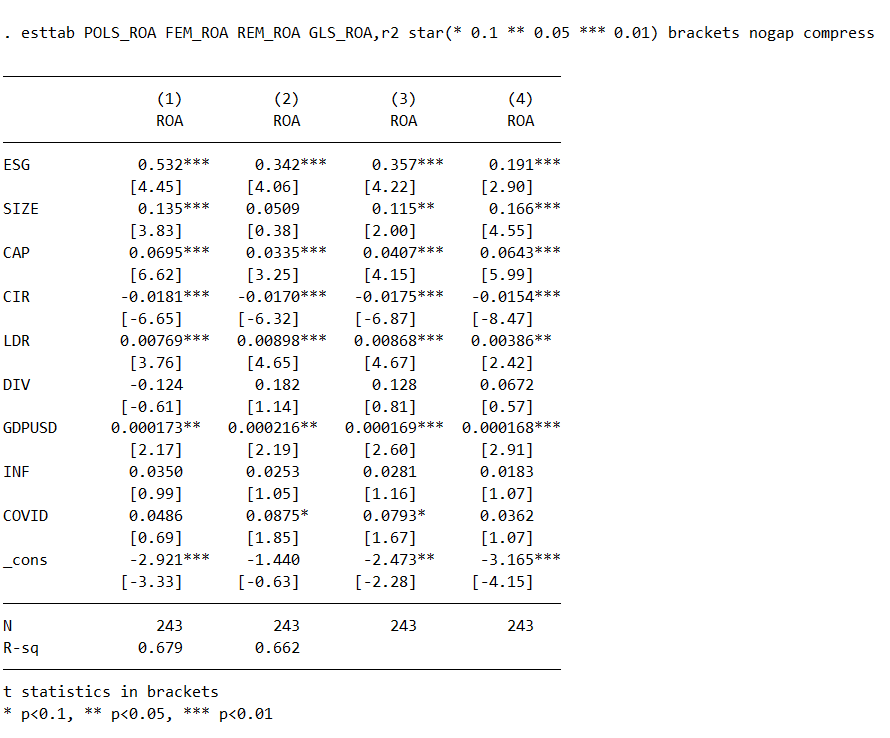 Tải kết quả mô hình POLS FEM REM GLS bằng câu lệnh esttab