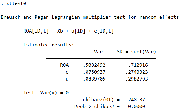 (2) Kiểm định Breusch - Pagan Lagrangian (câu lệnh xttest) nhằm lựa chọn phương pháp OLS hay REM là phù hợp cho hồi quy dữ liệu mẫu, dựa trên giả định H0 phương sai sai số không đổi vì phương sai là nguyên nhân tạo nên sự khác biệt giữa OLS và REM: