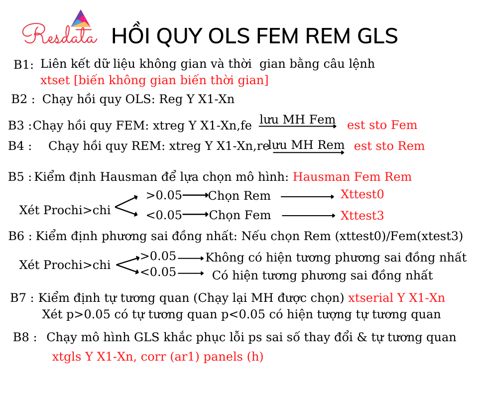 Tóm tắt quy trình thực hành chạy mô hình hồi quy dữ liệu bảng OLS FEM REM OLS GLS