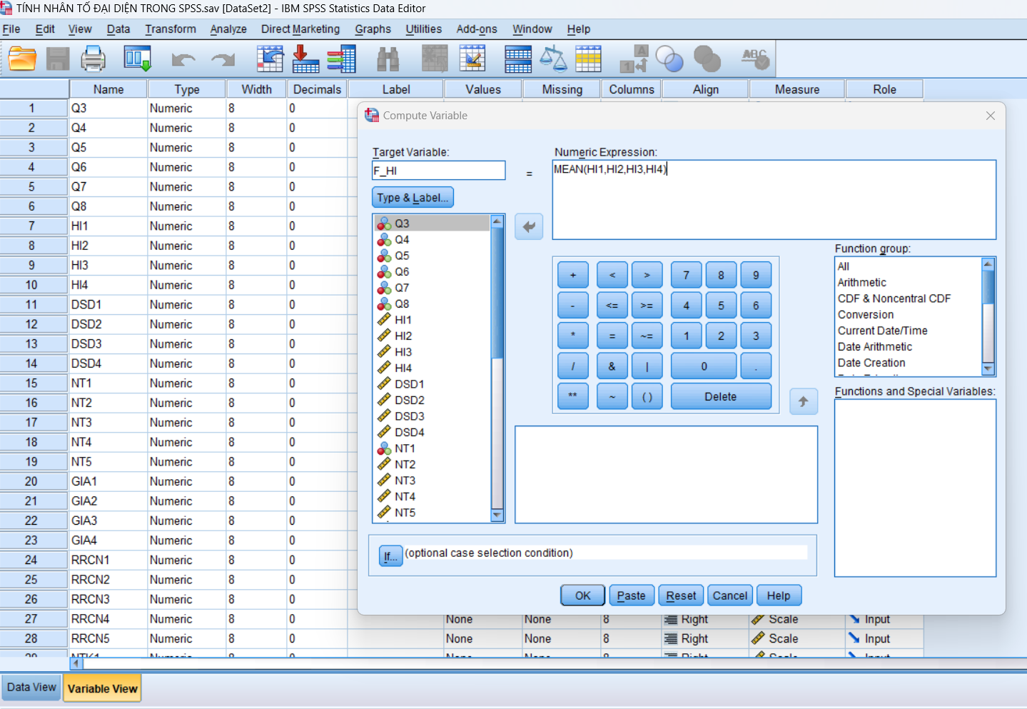 Sau đó nhập tên biến đại diện (ở đây là F_HI) vào ô Target Variable. Ô Numeric Expression nhập vào công thức tính trung bình cộng mean(HI1,HI2,HI3,HI4). Về mặt ý nghĩa, mean() là hàm công thức tính giá trị trung bình đại diện cho nhân tố này. Sau đó nhấn OK.