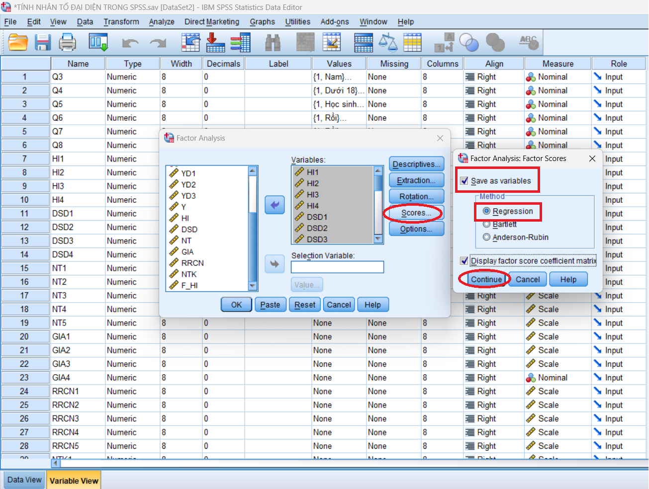 Nếu bạn tiếp tục chạy tương quan và hồi quy đa biến… trong SPSS thì bước tiếp theo là phải tính được nhân số đại diện cho các nhân tố này. Thường có 2 cách:
