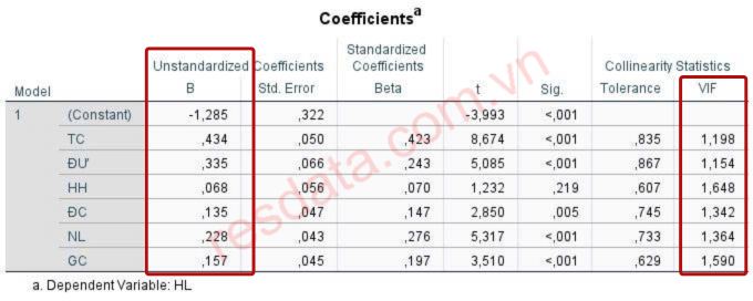 Trong bảng Coefficients, SPSS cung cấp hai loại hệ số hồi quy với chức năng khác nhau: