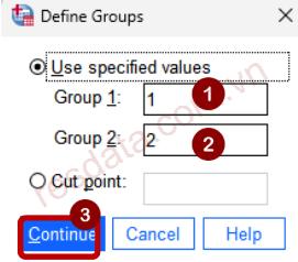 Biến Giới tính có hai giá trị đã được mã hóa gồm 1 là nam và 2 là nữ, chúng ta sẽ điền hai số này vào hai ô trống Group 1 và Group 2 (không cần phải sắp xếp 1 đến 2, có thể điền ngược lại 2, 1). Tiếp tục nhấp vào Continue để quay về cửa sổ ban đầu. Sau đó nhấp OK để xuất kết quả ra output.