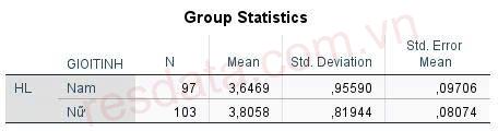 Bảng Group Statistics cho chúng ta các thông số mô tả của từng nhóm giới tính. Giá trị trung bình biến HL của hai nhóm nam/nữ bằng 3.6469 và 3.8058, không có sự chênh lệch đáng kể.
