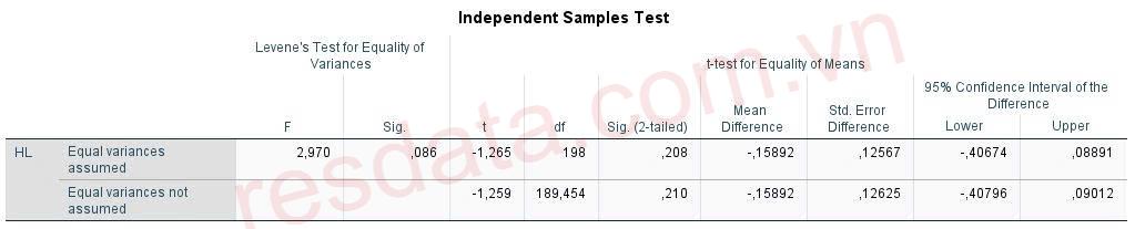 Bước 2: Sig kiểm định t bằng 0.208 > 0.05, như vậy không có sự khác biệt trung bình HL giữa các đáp viên thuộc hai nhóm khác nhau. Kết luận, không có khác biệt về mức độ Hài lòng (HL) giữa hai nhóm đối tượng này. Giả sử trường hợp sig kiểm định t nhỏ hơn 0.05, chúng ta kết luận có khác biệt trung bình HL giữa các đáp viên thuộc hai nhóm khác nhau.