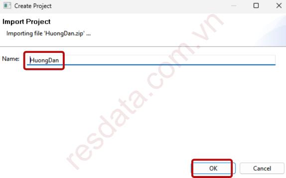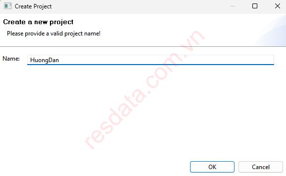 Cửa sổ Create Project xuất hiện, tiến hành đặt tên dự án ở ô Name, sau đó nhấp OK