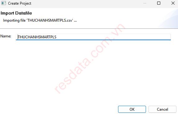 Khi quá trình import hoàn tất, SmartPLS 3 sẽ tự động hiển thị một dataset mới trong project với tên mặc định là Import Datafile. Tại bước này, bạn có thể đổi tên dataset để phù hợp hơn với nội dung nghiên cứu, ví dụ như DuLieuKhaoSat, Survey2025 hoặc DataSmartPLS. Việc đổi tên dữ liệu ngay sau khi import giúp bạn dễ dàng quản lý nhiều bộ dữ liệu khác nhau trong cùng một project, đồng thời tránh nhầm lẫn khi thực hiện phân tích hoặc xuất kết quả về sau. Sau khi đặt lại tên phù hợp, bạn chỉ cần xác nhận và tiếp tục sang bước xây dựng mô hình PLS-SEM.