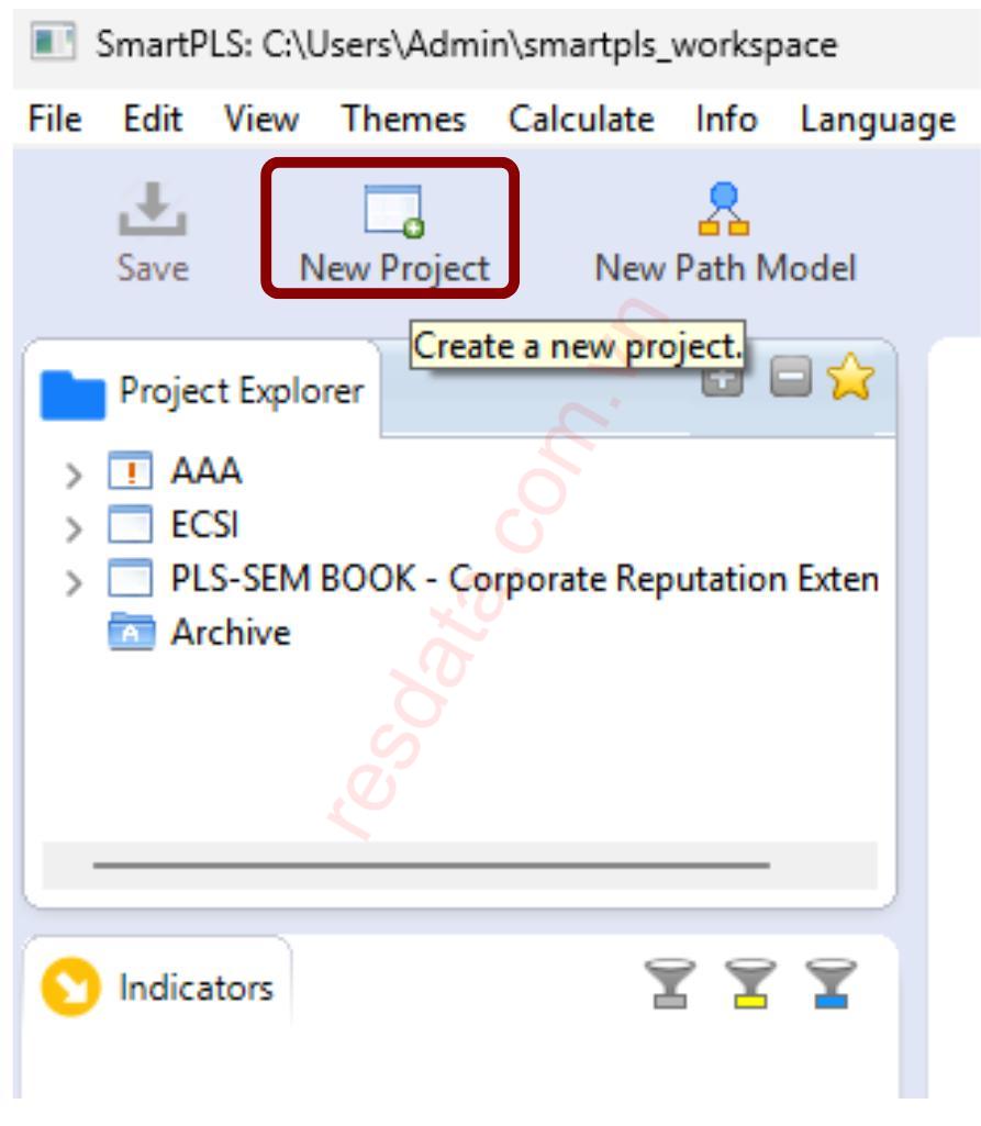 Sau khi chuẩn bị dữ liệu xong, bạn mở phần mềm SmartPLS 3 và tiến hành tạo file dự án mới bằng cách chọn New Project. Tên project nên đặt ngắn gọn, không dấu và phản ánh đúng nội dung đề tài nghiên cứu.