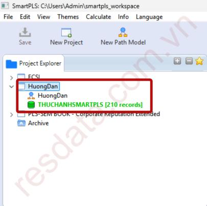 Lúc này trong giao diện SMARTPLS, ở mục Project Explorer chúng ta sẽ thấy dự án vừa được import vào.