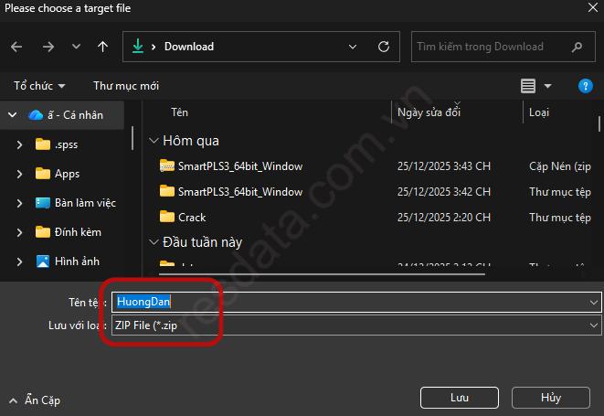 Một cửa sổ xuất hiện cho phép chúng ta lưu file dự án. Các bạn dẫn tới thư mục muốn lưu file, sau đó đặt tên file dự án ở hàng File name, hàng bên dưới Save as type chúng ta nên để mặc định đuôi dự án là .zip. Nhấp vào nút Save, chúng ta đã hoàn thành xuất file dự án trong SMARTPLS.