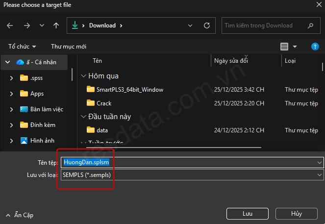 Một cửa sổ xuất hiện cho phép chúng ta lưu file mô hình. Các bạn dẫn tới thư mục muốn lưu file, sau đó đặt tên file dự án ở hàng File name, hàng bên dưới Save as type chúng ta nên để mặc định đuôi dự án là .splsm. Nhấp vào nút Save, chúng ta đã hoàn thành xuất file mô hình SEM-PLS trong SMARTPLS.