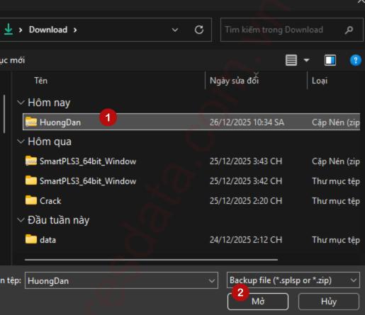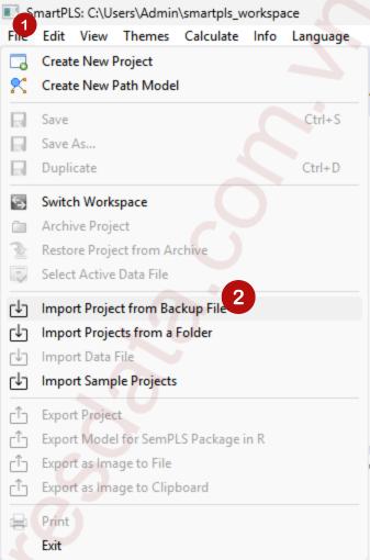 Để mở file dự án SMARTPLS đã lưu. Chúng ta khởi động phần mềm SMARTPLS, sau đó vào File, chọn Import Project from Backup File.