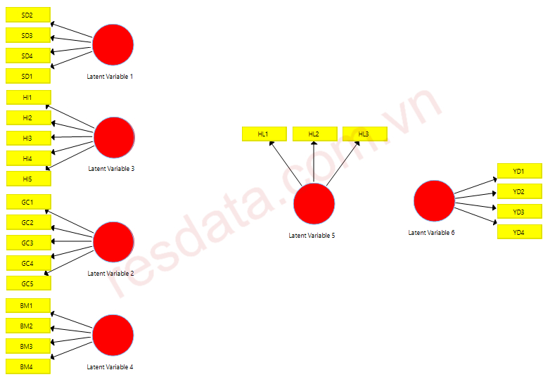 Phần mềm sẽ tự động tạo ra một biến tiềm ẩn (vòng tròn đỏ) gắn liền với các biến quan sát (hình chữ nhật màu vàng).