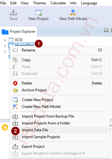 Khi quá trình import hoàn tất, SmartPLS 3 sẽ tự động hiển thị một dataset mới trong project với tên mặc định là Import Datafile. Tại bước này, bạn có thể đổi tên dataset để phù hợp hơn với nội dung nghiên cứu, ví dụ như DuLieuKhaoSatSurvey2025 hoặc DataSmartPLS.