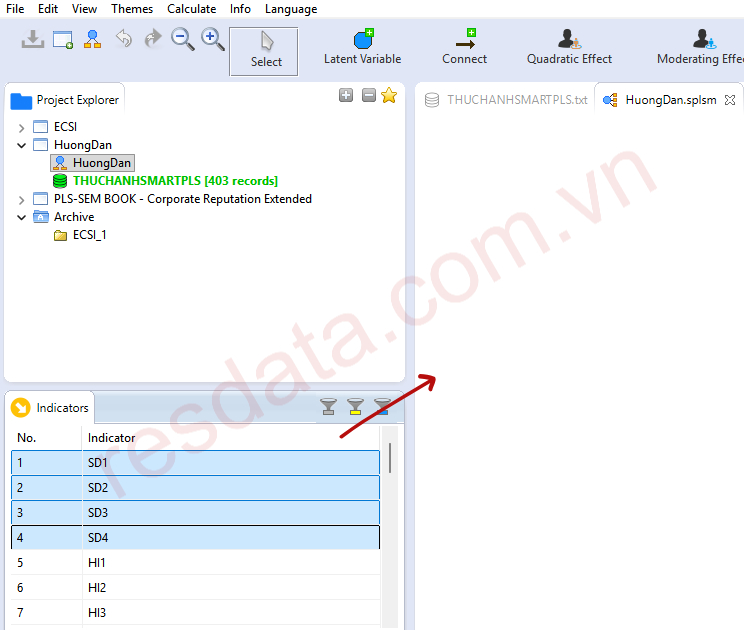 • Thực hiện: Chọn các biến quan sát của cùng một nhóm (Ví dụ: SD1, SD2, SD3, SD4). Giữ chuột trái và kéo chúng thả sang vùng trắng bên phải (Canvas).