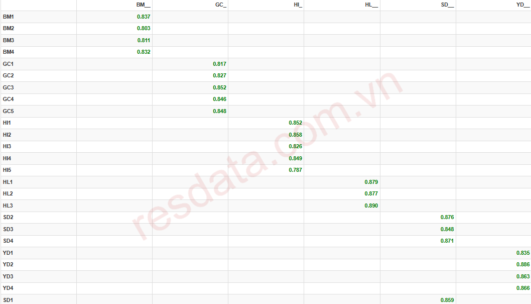 Theo cách tiếp cận truyền thống, Fornell và Larcker (1981) đề xuất đánh giá giá trị phân biệt thông qua căn bậc hai AVE. Mô hình đạt yêu cầu khi căn bậc hai AVE của mỗi biến tiềm ẩn lớn hơn hệ số tương quan giữa biến đó với các biến còn lại. Trong bảng Fornell–Larcker, các giá trị nằm trên đường chéo chính là căn bậc hai AVE, còn các giá trị phía dưới là hệ số tương quan giữa các biến tiềm ẩn. Trường hợp biến tiềm ẩn chỉ có một biến quan sát, căn bậc hai AVE có thể bằng 1.