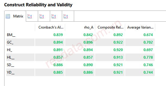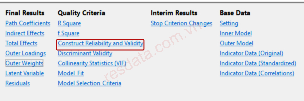 Để xem Cronbach's Alpha và Composite Reliability trên SMARTPLS, chúng ta chọn dòng Construct Reliability and Validity ở mục 3.