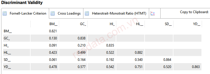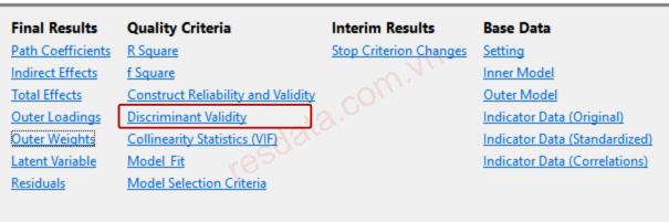 Để xem bảng Fornell and Larcker và HTMT trên SMARTPLS, chúng ta chọn dòng Discriminant Validity ở mục 3.