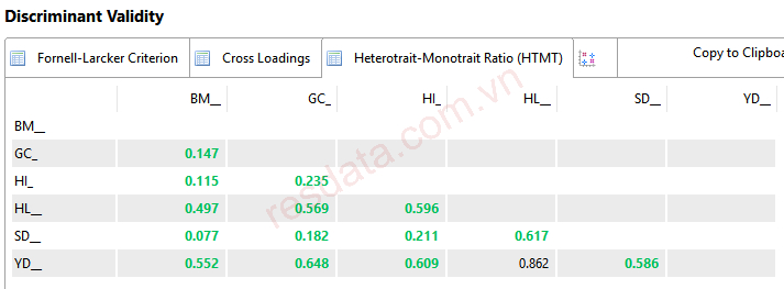 Về ngưỡng đánh giá HTMT, Garson (2016) cho rằng HTMT < 1 là chấp nhận được, Henseler et al. (2015) đề xuất HTMT < 0.9, trong khi Kline (2015)Clark & Watson (1995) khuyến nghị ngưỡng nghiêm ngặt hơn là HTMT < 0.85. SmartPLS mặc định sử dụng ngưỡng 0.85 để đánh giá giá trị phân biệt.