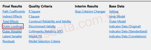 Để xem giá trị hệ số tải ngoài outer loading trên SMARTPLS, chúng ta chọn dòng Outer Loadings ở mục 3.