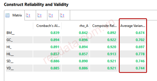 Để xem AVE trên SMARTPLS, chúng ta chọn dòng Construct Reliability and Validity ở mục 3.