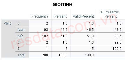 Kết quả thống kê tần số cho thấy biến giới tính xuất hiện một số giá trị không hợp lệ như 0, 6, 7.