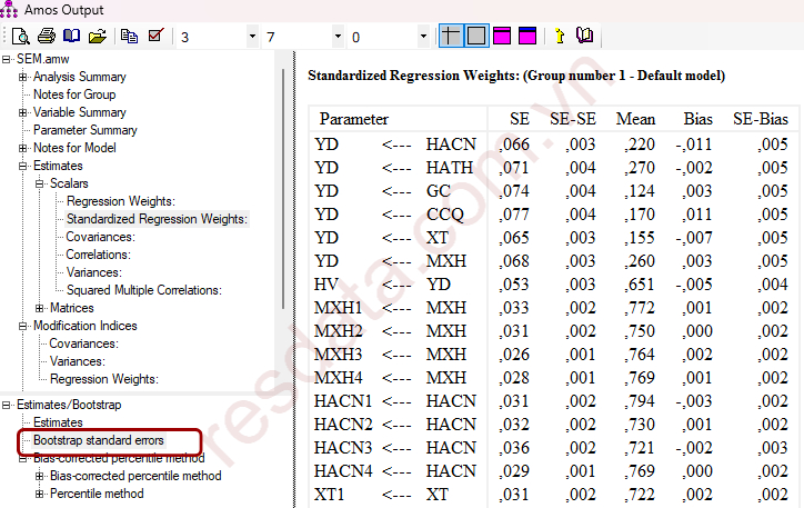 SE thể hiện mức độ biến thiên của hệ số hồi quy giữa các mẫu Bootstrap trong AMOS.
