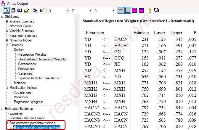 Khi thực hiện Bootstrap, AMOS cho phép đánh giá ý nghĩa thống kê của quan hệ trung gian thông qua hai tiêu chí chính: