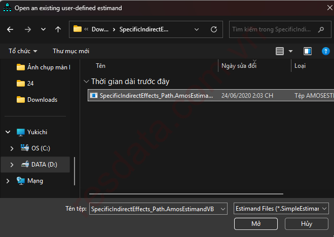 Tiếp theo, bạn duyệt đến thư mục đã lưu file SpecificIndirectEffects_Path.AmosEstimandVB.vb ở bước trước và chọn file này để tiếp tục thiết lập estimand.