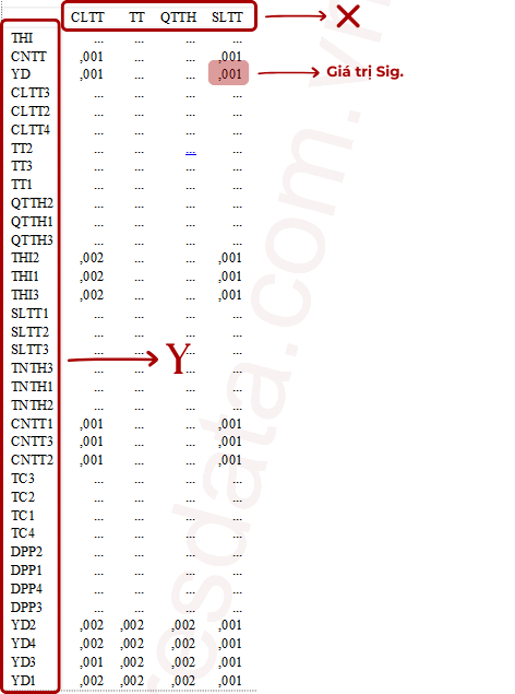 Sau khi lựa chọn, tại khu vực bên phải màn hình, AMOS sẽ hiển thị giá trị Sig của Standardized Indirect Effects cho tất cả các mối quan hệ gián tiếp trong mô hình SEM. Trong bảng kết quả này, hàng ngang thể hiện biến độc lập (X) và cột dọc thể hiện biến phụ thuộc (Y); sự kết hợp giữa hàng và cột tạo thành ma trận các mối quan hệ gián tiếp, giúp dễ dàng theo dõi và đánh giá từng tác động trung gian.
