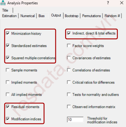 Tại thẻ Output, tích chọn các mục như trong hình minh họa. Trong đó, tùy chọn Indirect, Direct & Total Effects được sử dụng để xem và đánh giá tác động trực tiếp, tác động gián tiếp và tác động tổng hợp giữa các biến trong mô hình SEM.
