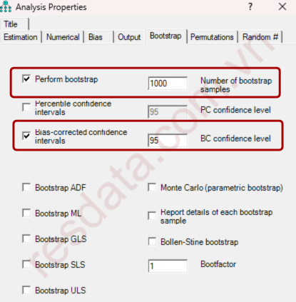 Tiếp theo, chuyển sang thẻ Bootstrap, tích chọn các tùy chọn như trong hình minh họa và điền các thông số cần thiết. Trong đó, Perform bootstrap là số lần lặp bootstrap, thường được sử dụng ở mức 1000 lần. Mục Bias-corrected confidence intervals được thiết lập ở 95%, tương ứng với độ tin cậy của kiểm định bootstrap khi đánh giá tác động gián tiếp trong mô hình SEM.
