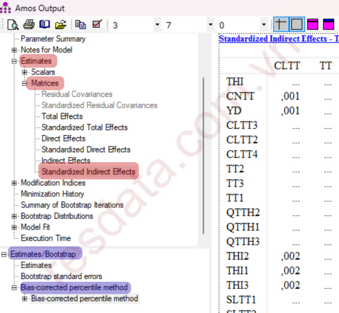 Sau khi chạy mô hình, tại cửa sổ Output, truy cập theo đường dẫn Estimates → Matrices → Standardized Indirect Effects để xem tác động gián tiếp chuẩn hóa trong mô hình. Tiếp theo, tại phần Bootstrap, chọn Bias-corrected percentile method → chọn bảng Two-Tailed Significance (BC) để hiển thị mức ý nghĩa thống kê tương ứng.