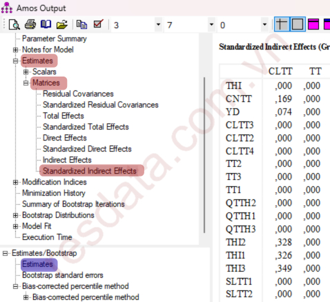 Tương tự cách đọc giá trị Sig, khi xem bảng Standardized Indirect Effects, chúng ta chỉ xét mối quan hệ giữa các cấu trúc tiềm ẩn, không xét các biến quan sát.