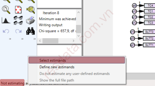 Tiếp theo, mở sơ đồ SEM trong AMOS 24. Tại giao diện làm việc của phần mềm, quan sát góc dưới bên trái, bạn sẽ thấy dòng thông báo “Not estimating any user-defined estimand”. Nhấp chuột trái hoặc phải vào dòng này và chọn Select estimands để bắt đầu khai báo estimand.