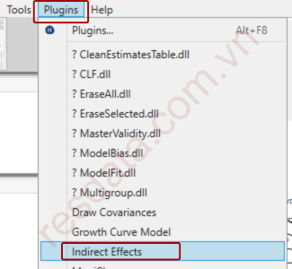 Sau khi cài đặt plugin thành công, quay lại giao diện mô hình SEM trên AMOS. Trên thanh menu, chọn Plugins → Indirect Effects để tiến hành phân tích tác động gián tiếp riêng biệt (specific indirect effects).
