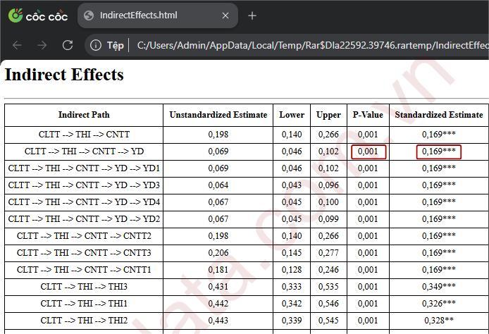 Dựa trên bảng Standardized Indirect Effects, kết quả cho thấy CLTT có tác động gián tiếp dương đến CNTT với hệ số chuẩn hóa là 0,169, đồng thời tác động gián tiếp đến YD đạt 0,074.