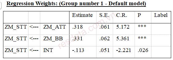 Sau khi chạy mô hình, tại cửa sổ Output, chúng ta tiến hành đọc và phân tích bảng Regression Weights để đánh giá mối quan hệ điều tiết trong mô hình.