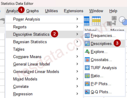 Tại giao diện SPSS, vào menu: Analyze → Descriptive Statistics → Descriptives…