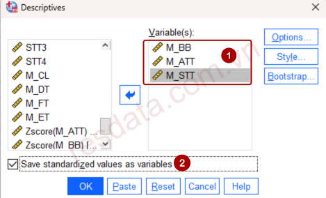 Trong cửa sổ Descriptives, đưa ATT, BB và STT vào ô Variables. Sau đó tích chọn Save standardized values as variables và nhấn OK.