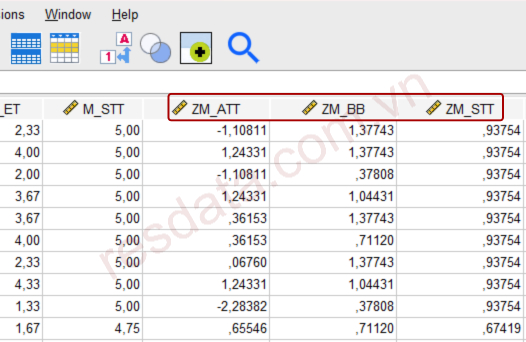 Sau khi thực hiện chuẩn hóa, trong bộ dữ liệu sẽ xuất hiện ba biến mới tương ứng với ATT, BB và STT ở dạng chuẩn hóa.