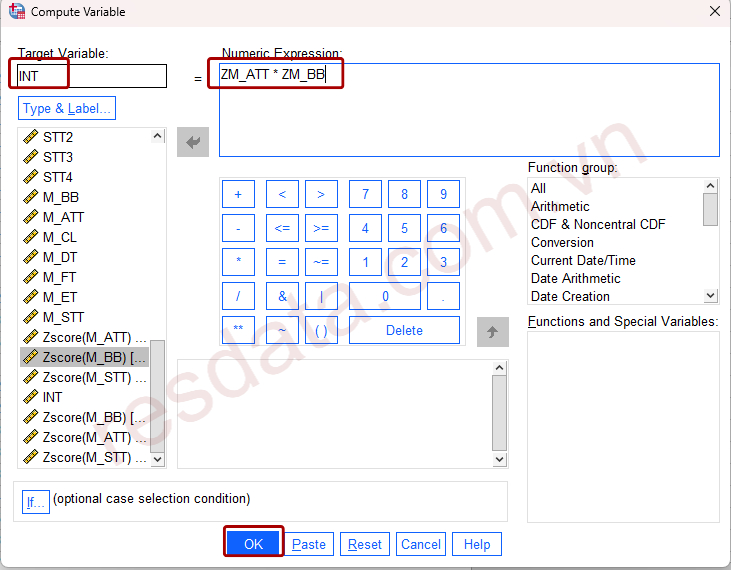 Ở ô Numeric Expression, nhập công thức ZM_ATT × ZM_BB, trong đó ZM_ATT và ZM_BB là hai biến ATT và BB ở dạng chuẩn hóa vừa được tạo ở bước trước.
