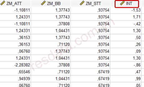 Sau khi thực hiện xong thao tác, trong bộ dữ liệu sẽ xuất hiện biến INT, đại diện cho tương tác giữa ATT và BB, dùng cho phân tích biến điều tiết trong AMOS.
